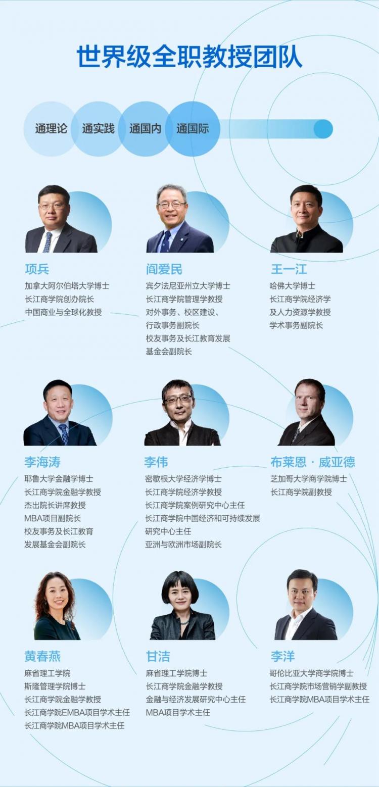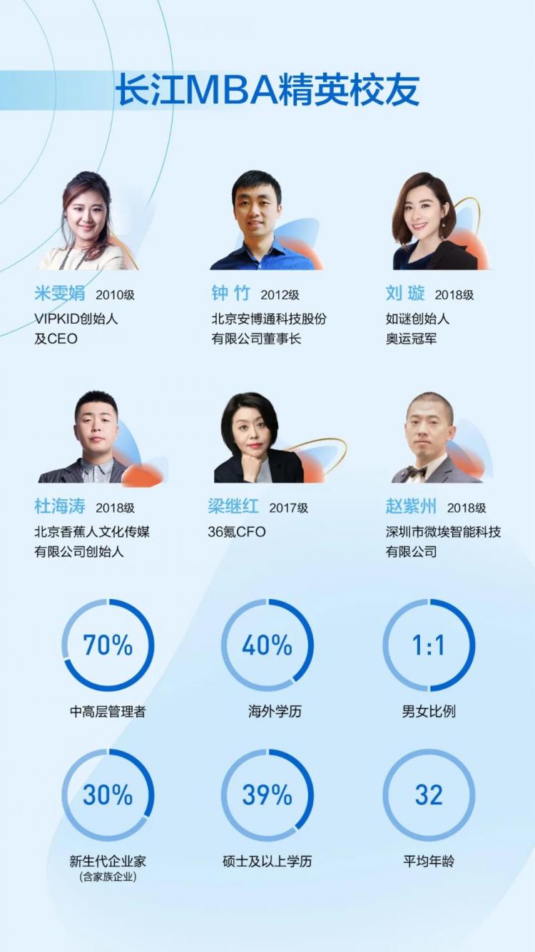 从金融、金融、互联网领域的大佬,到影视界的明星;从创业新势力,到二代接班人;从名校海归毕业生,到各行各业的企业高管……,十几年间,数以千计的精英学子披荆斩棘,在全国联考中取得优异成绩后汇入长江,经过两年的学习,拿到沉甸甸的MBA学位。他们生龙活虎,腾蛟起凤,共同交织成长江MBA波澜壮阔的画卷。