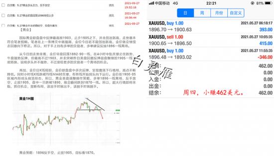 回顾周四,笔者先是看多,随后黄金多头力量不足,立马改变思路转空。随后黄金阶梯式下跌,最低触碰1888附近。交易三单,第一单:1896多,1900出局,盈利393;第二单:1900空,1896出局,盈利415;第三单:1896多,1893出局,损掉346;共获利462。