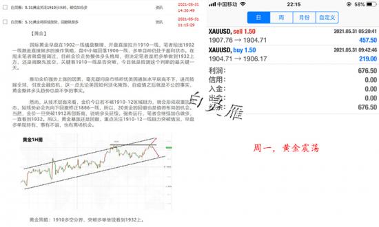 回顾周一,黄金笔者看多,行情日内横盘,并未有什么波动。单子共两单;第一单:1907进空,1904出局,获利457;第二单:1904进多,1906出局,获利219;周一共获利676美元。