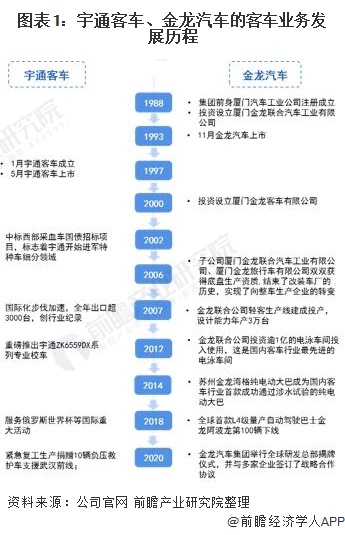 中国是全球客车制造行业的最大制造国、出口国。目前,国内客车制造行业发展较为成熟,市场竞争激烈。其中宇通客车、金龙汽车是国内乃至全球客车制造行业的两大龙头企业,两家企业的客车业务布局历程如下: