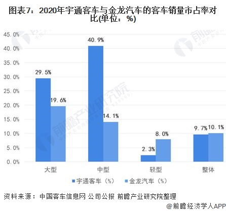 根据中国客车信息网数据,2020年全国各类型客车销量总计为430110辆,其中大型客车有56438辆、中型客车有42500辆、轻型客车有331172辆。由此得到,2020年,在客车整体销售市场,金龙汽车市占率为10.1%,略高于宇通客车的9.7%;