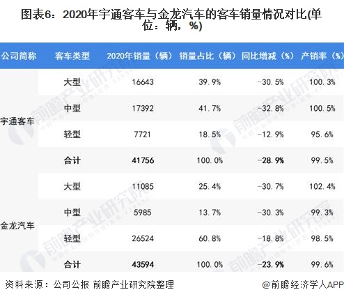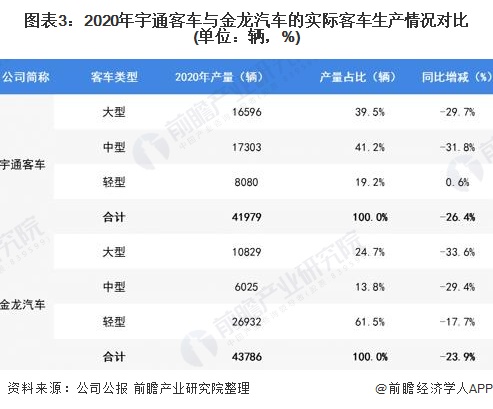 从企业客车总产量来看,2020年金龙汽车产量为43786辆,同比下降23.9%,而宇通客车总产量为41979辆,同比下降26.4%;