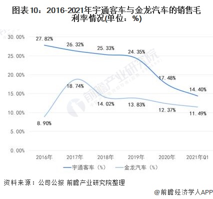 在企业营收方面,2016-2021年Q1宇通客车的营业收入均高于金龙汽车;在企业净利润方面,2016-2020年宇通客车的净利润远高于金龙汽车,2020年宇通客车净利润为5.18亿元,而金龙汽车仅为0.61亿元;从销售毛利率来看,2016-2021年Q1宇通客车的销售毛利率均在14%以上,对应年度均高于金龙汽车。