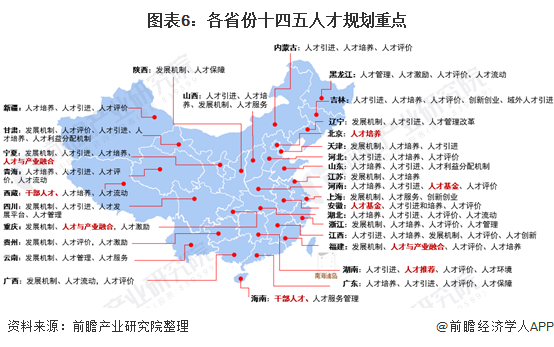 从各省份的人才十四五规划中可以看到,北京目前较重视人才培养、西藏和海南偏重干部人才队伍建设、安徽和河南则关注人才基金,宁夏、重庆和福建均较重视人才与产业融合。从整体来看,北京和上海已经偏向于人才管理,而其他省份则以人才引进和培养为重心。
