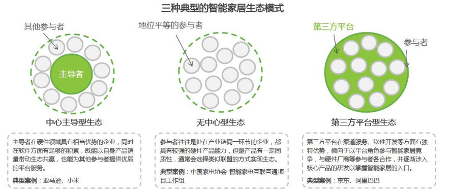 2. 生态模式:以生态连接各垂直细分领域,发挥企业核心优势。智能家居行业涉及面非常广泛,各垂直细分领域之间壁垒高,完整的智能家居生态不是某个或某几个独立的智能单品所能代表的。行业本身的特性意味着一家独大的情形难以出现,势必要跨界融合,将不同环节和细分领域的参与者囊括进来。