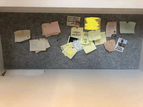 学校自修室的桌子上贴满了朋友们打气加油的便利贴