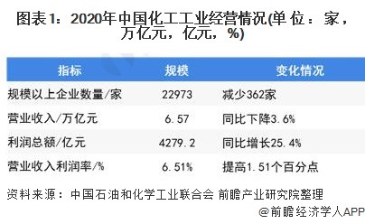 中国石油和化学工业联合会资料显示,2020年,化学工业效益在二季度后回升持续加快,三季度后利润增长迅速,主要经济指标大幅向好。2020年全年,化工行业规模以上企业22973家,较上年减少362家,化学工业营业收入6.57万亿元,下降3.6%;利润总额4279.2亿元,同比增长25.4%;化工行业营业收入利润率为6.51%,提高1.51个百分点。整体来看,2020年国内化学工业效益实现显著增长。