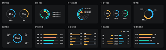 图表需要用颜色区分数据的区别,但是要避免用色太杂,反而不容易理解数据。建议使用同样明度和饱和度的颜色,低饱和度的颜色观感会更加舒适。如果图表数量多,同一类目最好用同一种颜色。在数据图表里,多采用冷暖色、互补色能产生强烈对比,突出重点信息。