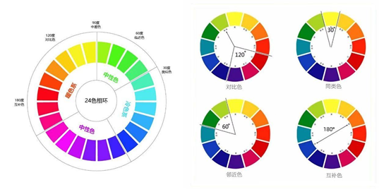 - 临近色:临近色是在色环上距离 60° 左右的色彩,形成的配色效果风格和谐统一。