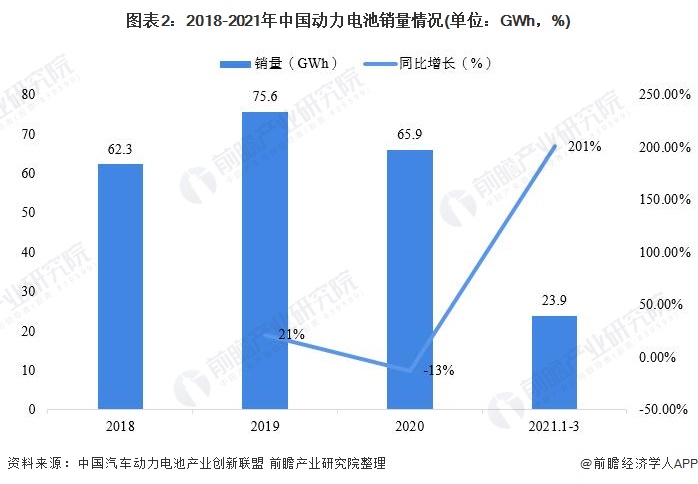 2020年,我国动力电池销量也有所下降,较2019年减少13%。2021年1-3月,我国动力电池销量恢复增长,销量累计达23.9GWh,同比增长201%。