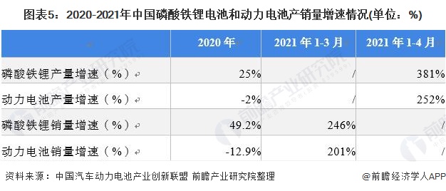 从产销量增速来看,磷酸铁锂电池产销量增速高于行业整体增速水平。2020年,全国动力电池产销量均有所下降,但磷酸铁锂电池产销量却有所增长;2021年1-4月,磷酸铁锂电池产量达21.2GWh,同比累计增长381%;2021年1-3月,我国磷酸铁锂电池累计销售11.1GWh,同比累计增长246%。