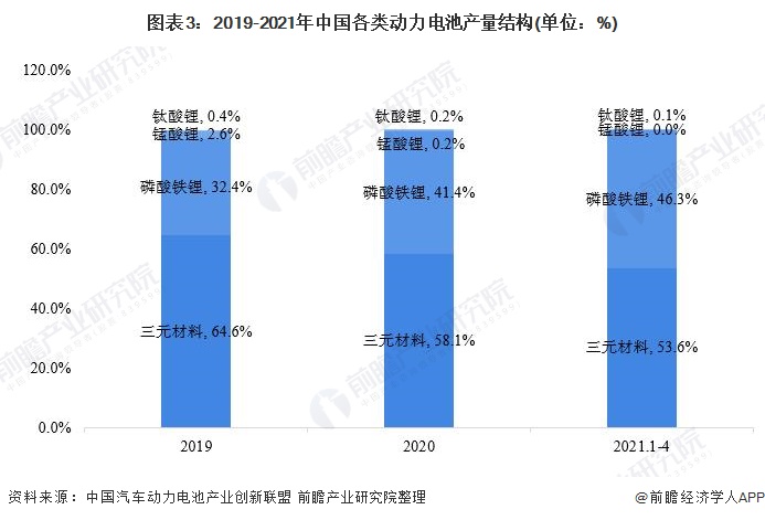 从各类材料的动力电池产量来看,三元电池是我国产量最多的电池类型,但三元电池占比在逐渐减小。2019-2021年4月,我国三元电池占比从64.6%降至53.6%;而磷酸铁锂电池占比在逐渐增大,从32.4%增至46.3%。