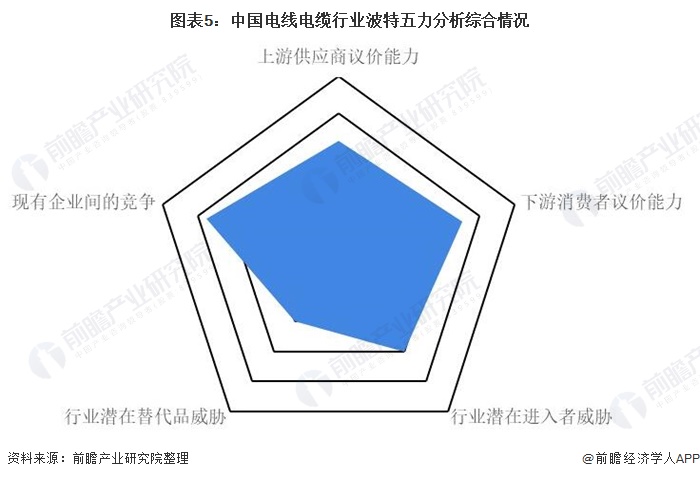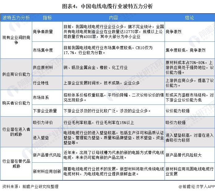对于电线电缆行业的未来发展分析,前瞻通过波特五力分析模型给出了一定的答案。2020年,我国电线电缆行业的规模以上公司数量超过4000家,其中75%以上为中小企业,上市企业不足30家,行业中参与者众多。市场集中度较低,企业的领先者尚未出现,未来将会面临更加严峻的行业竞争。