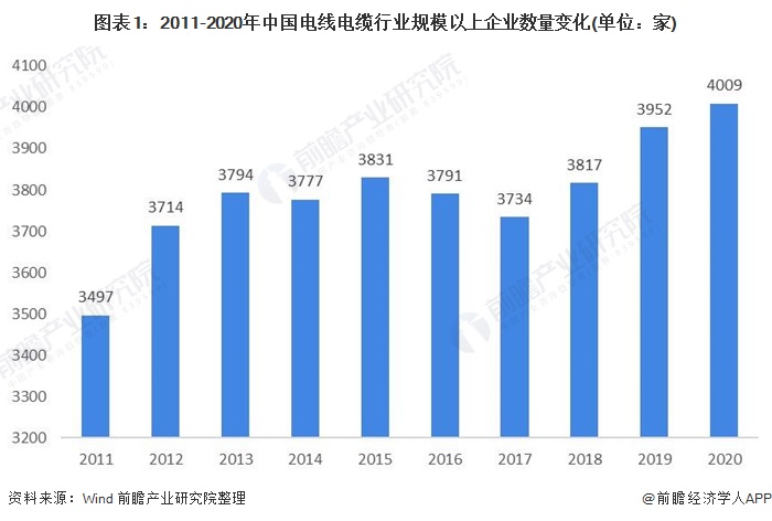 2011-2020年我国电线电缆行业规模以上企业总体呈现出波动上升的趋势。2020年,我国有电线电缆制造企业共计12770家,但规模以上企业仅有4009家,大部分都是中小企业。