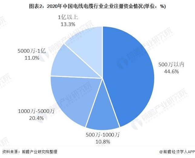 就目前企业的注册资金来看,电线电缆企业注册资金500万以内的占比约为44.6%,注册资金在500-5000万的约为31.2%,两者合计占比为75.8%。对应着的电线电缆制造企业大部分生产着中低端产品,这也揭示了我国电线电缆行业目前的现状,高端市场仍然在不停的追赶外资企业,中低端市场过于饱和,形成无序竞争。