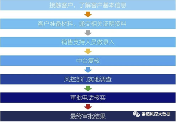 线下金融转型线上场景是行业共识,其实从其效率跟流程上来说,就知道其必要性。从业过线下信贷的朋友,对信贷工厂的流程应该不陌生,流程大概如下: