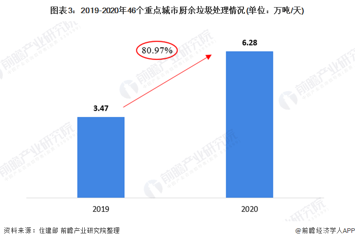 2020年12月4日,住建部召开新闻通气会,就《进一步推进生活垃圾分类工作的若干意见》(以下简称《意见》)进行政策解读。住建部介绍,我国46个重点城市厨余垃圾处理能力已从2019年的3.47万吨/天,提升到6.28万吨/天,年提升率为80.97%。