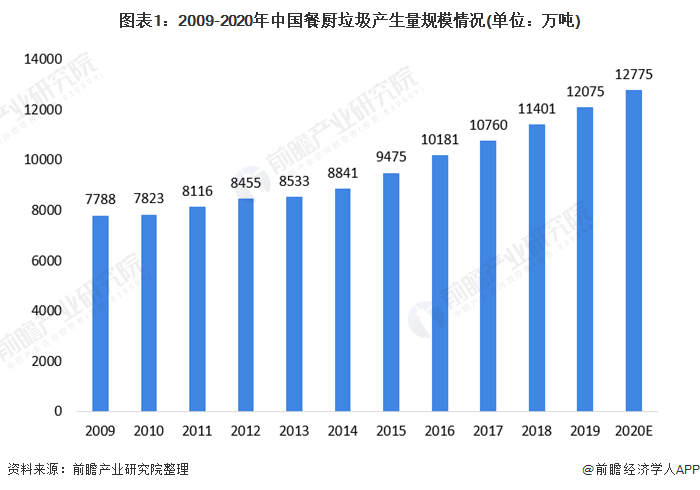 随着我国消费升级,餐饮行业的发展迅速,尤其是外卖行业的快速发展,餐厨垃圾的产生也逐年递增。2015年全国餐厨垃圾产生量达9475万吨,日均产量达26万吨/日。2019年,全国餐厨垃圾产生量达到12075万吨。