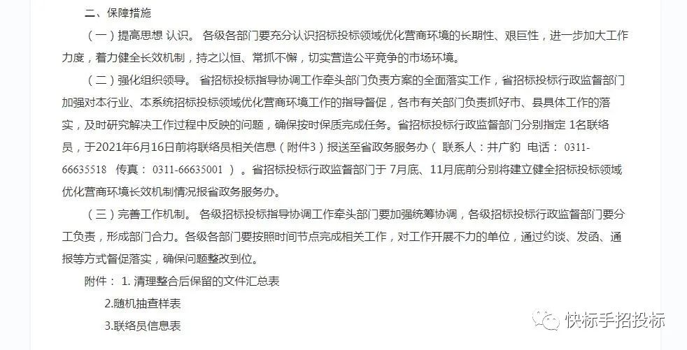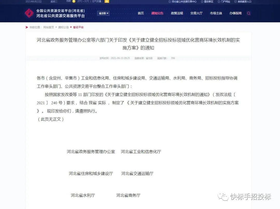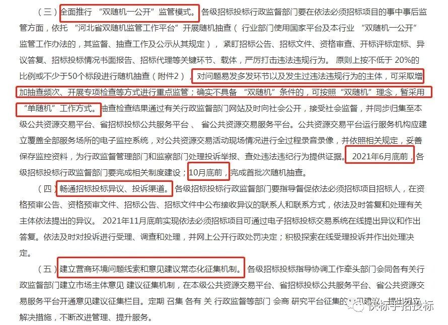 近日,河北省公共资源交易服务平台发布《河北省政务服务管理办公室等六部门关于印发<关于建立健全招标投标领域优化营商环境长效机制的实施方案>的通知》,全面推行 “双随机一公开”监管模式,原则上按不低于 20%的比例或不少于50个标段进行随机抽查。