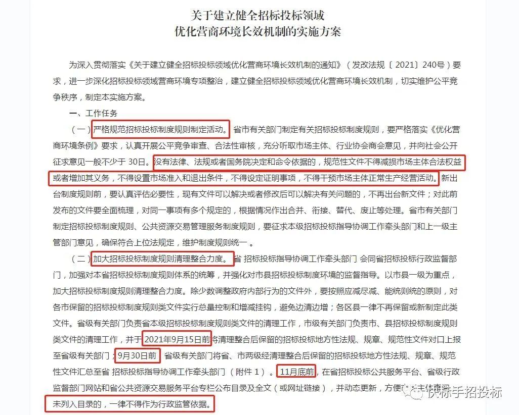 《关于建立健全招标投标领域优化营商环境长效机制的实施方案》(下面简称《实施方案》)中规定制定有关招标投标制度规则,向社会公开征求意见一般不少于 30日;没有法律、法规或者国务院决定和命令依据的,规范性文件不得减损市场主体合法权益或者增加其义务,不得设置市场准入和退出条件,不得设定证明事项,不得干预市场主体正常生产经营活动。