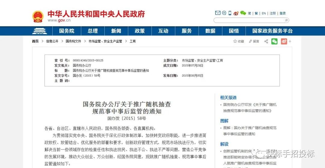 2015年8月,国务院发布《国务院办公厅关于推广随机抽查规范事中事后监管的通知》,提出建立“双随机”抽查机制,实行“双随机一公开”监管模式。