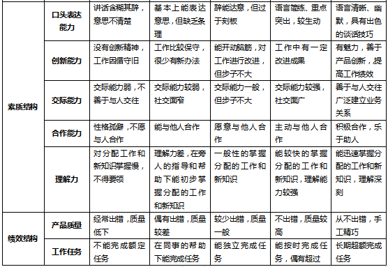 可细分为业务知识、业务技能、计划能力、判断能力、解决问题能力、应变能力、人际技能、理解能力、学习能力、创新能力和领导控制能力(这项能力及以下能力适用于部门经理上的管理人员)、决策能力、指导帮助下属能力、组织能力、员工管理能力等。