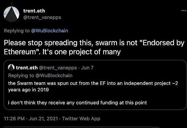 翻译:请停止传播,“SWARM获得以太坊基金会支持”的消息,这只是是许多项目中的一个。Swarm团队在2019年就从以太坊分基金会拆分成为一个独立的项目,不再获得以太坊基金会的任何支持。