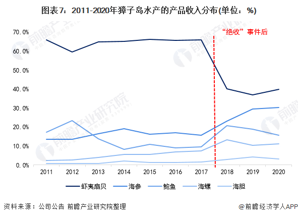 2020年,獐子岛以往最引以为豪的虾夷扇贝类已经从65%左右的份额占比下跌至2020年的39.8%,随之上升的是海参和鲍鱼,分别从2017年的15.7%、9.5%上升至2020年的30.3%和15.6%。