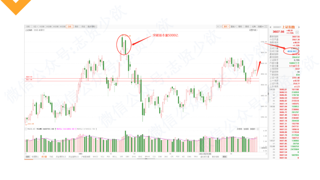 上面图里的两根支撑线,早在端午节前就已经画出。指数这次的最低点3503也和知识星球上关注的3502支撑位精确匹配。本周如果出现单日5000亿的成交量,突破3731前高的机率就非常大了!而这个机率还应该从基本面着手进行研究确认!