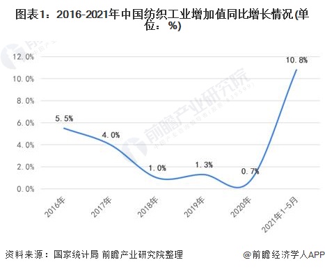从纺织工业增加值来看,2016-2020年全国纺织工业增加值持续处于增长区间,但增速逐年下降。到2021年1-5月份全国累计纺织工业增加值呈现恢复性大幅增长10.8%。