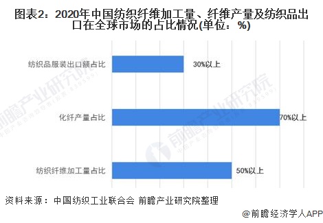 从国内纺织工业在全球市场地位来看,2020年,我国纺织纤维加工总量达5800万吨,占世界纤维加工总量的比重保持在50%以上;化纤产量占世界的比重70%以上;纺织品服装出口额达2990亿美元,占世界的比重超过三分之一,稳居世界第一。