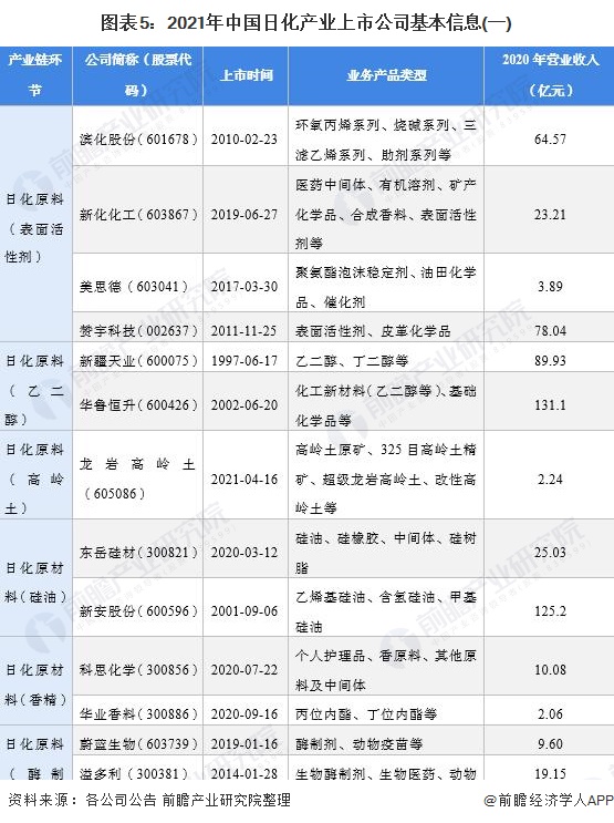 日化原料——高岭土上市企业:龙岩高岭土(605086);日化原料——硅油上市企业:东岳硅材(300821)、新安股份(600596);