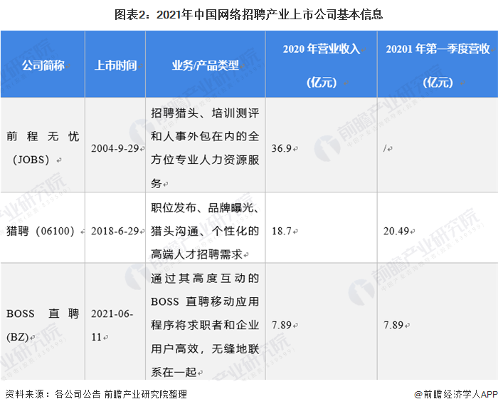 网络招聘已经成为了目前人们求职的首选方式。目前我国网络招聘上市公司数量仅为3家,主要包括:前程无忧(JOBS), 猎聘(06100), BOSS直聘(NASDAQ: BZ).