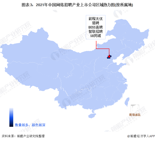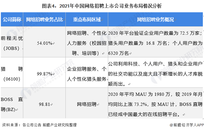 网络招聘行业的上市公司中,前程无忧和猎聘网络招聘的网络招聘业务布局范围较大,两家除了网络招聘外还提供个人用户的猎头服务。