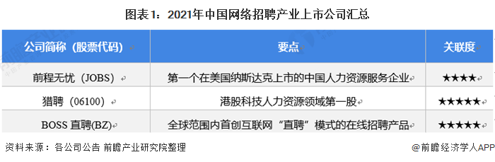 网络招聘行业主要上市公司:目前国内互联网招聘行业的上市公司较少主要有前程无忧(JOBS), 猎聘(06100), BOSS直聘(NASDAQ: BZ)等。