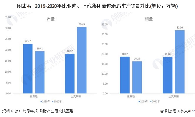 从两家公司新能源汽车产销来看2019年,比亚迪的新能源汽车产销均高于上汽集团,但是2020年上汽集团产销增长幅度较大,均超越比亚迪。2020年上汽集团新能源汽车产量为30.49万辆,较比亚迪多12.42万辆;2020年上汽集团新能源汽车销量实现32.00万辆,较比亚迪多13.54万辆。其中,上汽乘车分公司在2020年销量7.68万辆,排全国第三,上汽通用五菱在2020年销售17.08万辆排全球第四。综合来看,2020年,上汽集团在新能源汽车领域领先。