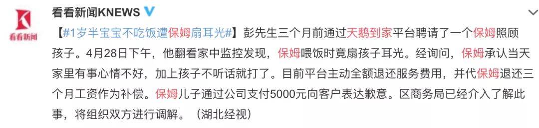 除培训不到位、没有服务保障等问题外外,更有甚者,用户通过天鹅到家聘请的保姆,在喂饭时竟扇孩子耳光。