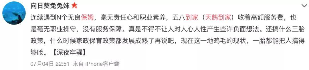 高抽成、不足额缴纳社保,种种行为都对月嫂、保姆等服务热情造成负面作用,间接影响用户消费体验。在社交平台上,不少用户对于天鹅到家月嫂保姆的服务质量颇有诟病。