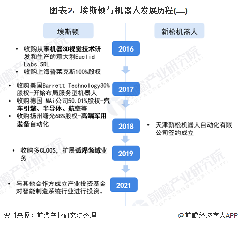 目前中国工业机器人行业龙头企业有埃斯顿(002747)与机器人(300024),通过对两家龙头企业的梳理可以发现,埃斯顿成立时间较早,从数控机床业务做起,直到2011年才开始布局机器人领域,到2013年才从军工业机器人着手开展工业机器人的发展,并逐渐成为主业,在其整体发展过程中,在上市后获得足够的资金实力,便通过收购国内外不同细分领域的公司以增强自身工业机器人的实力。