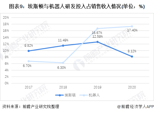 研发投入占比方面,2017-2020年间机器人的研发投入金额一直高于埃斯顿,在2019年时更是加大了研发投入力度,研发投入占销售收入的比例直接提升了10个左右百分点,2020年时机器人的研发占比为17.4%;埃斯顿的研发投入则逐年稳定上升,研发投入占比波动变化,在2020年时埃斯顿的研发投入金额为2.04亿元,占比为8.12%。