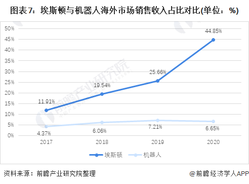 从区域分布来看,埃斯顿对海外公司的成功收购使得海外市场的营收占比在一年内提升了19.19个百分点达到了11.26亿元,在2020年时埃斯顿海外业务占比达到了44.85%;与此同时,机器人的销售则主要集中在国内市场,国内市场的营收占比超过了90%,2020年时海外市场的占比仅有6.65%,远少于埃斯顿。