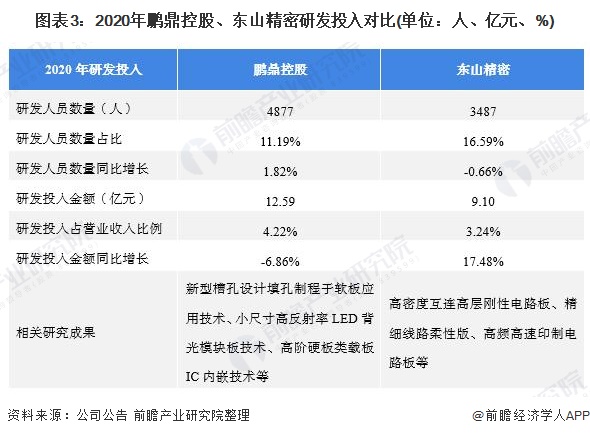 从鹏鼎控股和东山精密的研发投入来看,2020年鹏鼎控股的研发人员数量和研发投入金额均要多于东山精密,分别为4877人和12.59亿元。而东山精密的研发人员占比和研发金额增长率方面要明显高于鹏鼎控股。针对不同的业务技术核心,两家公司也产出了相关研究成果,提高了自身产品竞争力。