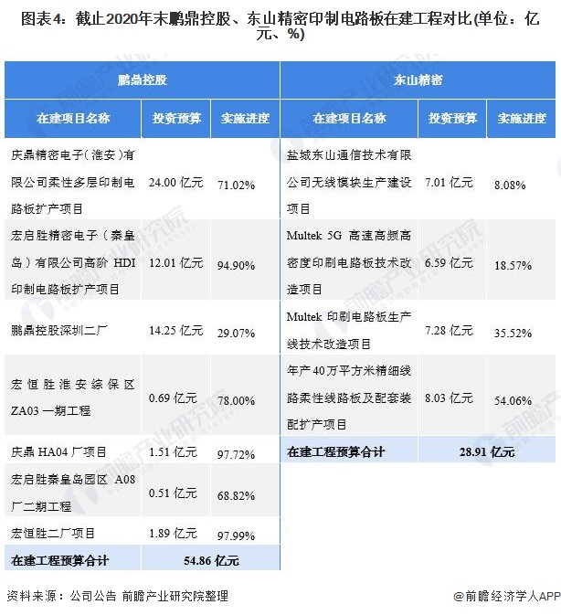 从截止2020年末鹏鼎控股、东山精密的印制电路板相关在建工程情况来看,鹏鼎控股和东山精密均有一定数量的在建工程,从总预算来看,鹏鼎控股的印制电路板相关在建工程合计预算约54.86亿元,核心项目有庆鼎精密电子(淮安)有限公司柔性多层印制电路板扩产项目等;东山精密的印制电路板相关在建工程合计预算约28.91亿元,核心项目有精细线路柔性线路板及配套装配扩产项目等。从工程进度来看,鹏鼎控股的大部分工程已进入后期收尾阶段,而东山精密的主要工程则处于前中期阶段。