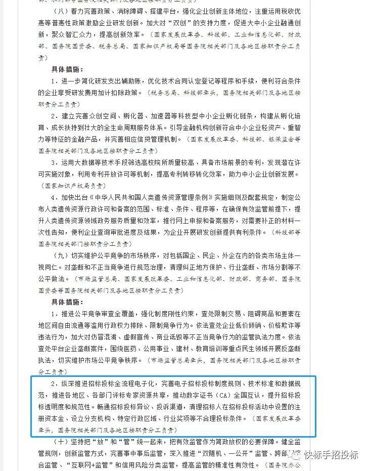 纵深推进招标投标全流程电子化,完善电子招标投标制度规则、技术标准和数据规范,推进各地区、各部门评标专家资源共享,推动数字证书(CA)全国互认,提升招标投标透明度和规范性。畅通招标投标异议、投诉渠道,清理招标人在招标投标活动中设置的注册资本金、设立分支机构、特定行政区域、行业奖项等不合理投标条件。