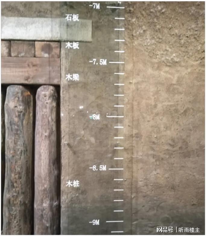 请大家注意,地下负几十米,一直到地下负八米,都是滚油和碳化工艺的,可以历经千年的巨木基础桩,往上是碳化的木梁,再是碳化木板,负七米处,是非常厚实的石板,上面再铺设了厚达七米(相当于两层多楼的高度)的砾石。