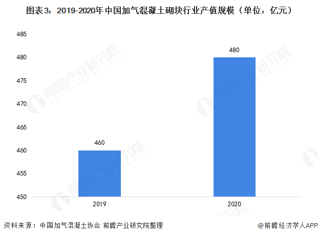 据中国加气混凝土协会数据显示,2019年,中国加气混凝土砌块行业产值约为460亿元。2020年,中国加气混凝土砌块行业产值约为480亿元。