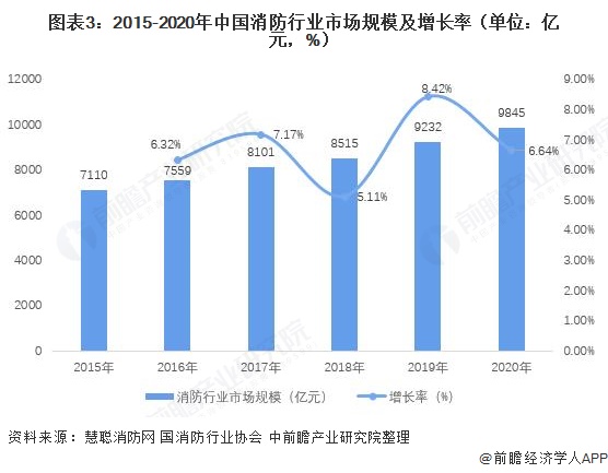 在政策的不断推进下,我国消防行业市场规模不断增长。2015-2020年,中国消防行业市场规模呈逐年增长趋势。2020年,中国消防行业市场规模实现9845亿元,较2019年同比增长6.64%。