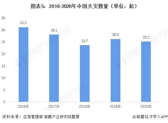 在我国政策不断重视以及消防应急设备的不断完善下,我国火灾数量呈下降趋势。根据应急管理部数据显示,2020年我国火灾数量为25.2起,较2019年下降1.1起。