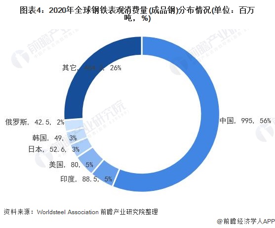 在消费量方面,中国也是全球第一大钢铁消费国。2020年,中国钢铁表观消费量(成品钢)为995百万吨,占全球钢铁表观消费量(成品钢)的56%。印度和美国钢铁表观消费量全球排名第二和第三,2020年全球钢铁表观消费量(成品钢)分别为88.5百万吨和80.5百万吨,均占全球钢铁表观消费量(成品钢)的5%。