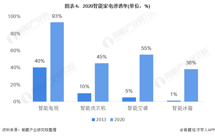 智能家居的最终形态是实现全屋产品的智能化,为AIoT的关键场景,在灯光、空调、电视、窗帘、门窗、背景音乐、安防、监控控制以及可编程定时控制等方面均有应用。2020年中国智能家居市场规模突破2400亿,智能家电平均渗透率超过60%。从智能家居各产品的渗透率来看,智能电视的产品渗透率最高。2013年智能电视的渗透率为40%,2020年已经增长到了93%。